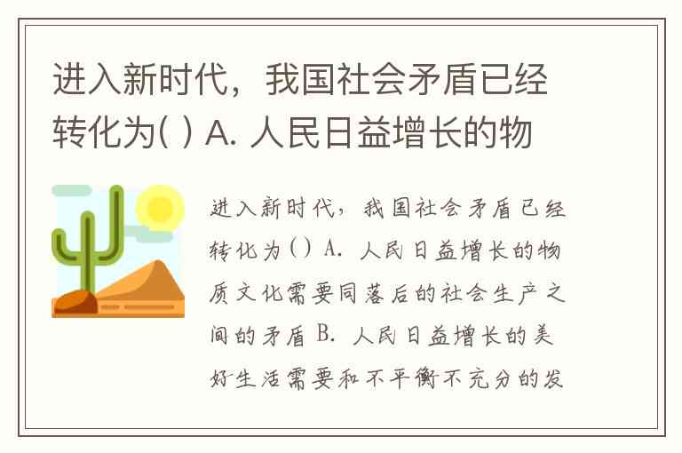 进入新时代,我国社会矛盾已经转化为( ) A. 人民日益增长的物质文化需要同落后的社会生产之间的矛盾 B. 人民日益增长的美好生活需要和不平衡不充分的发展之间的矛盾 C. 东部发达地区与中西部地区的矛盾 D. 城市与农村之间的矛盾