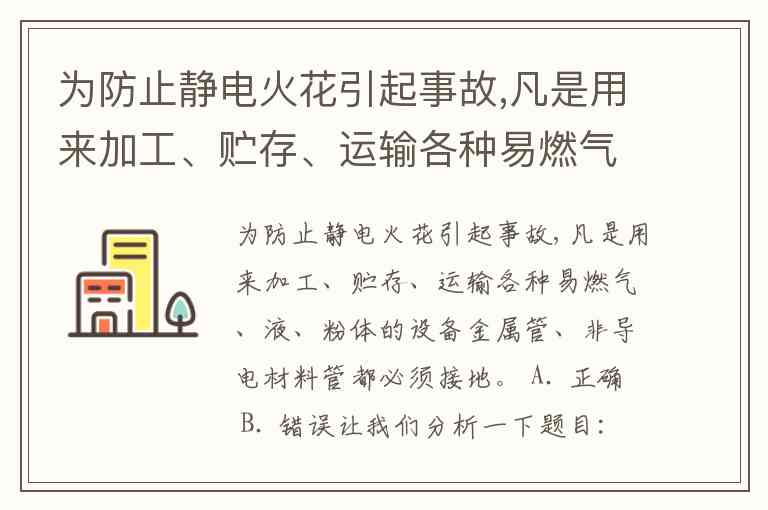题目说:“为防止静电火花引起事故,凡是用来加工、贮存、运输各种易燃气、液、粉体的设备金属管、非导电材料管都必须接地。”