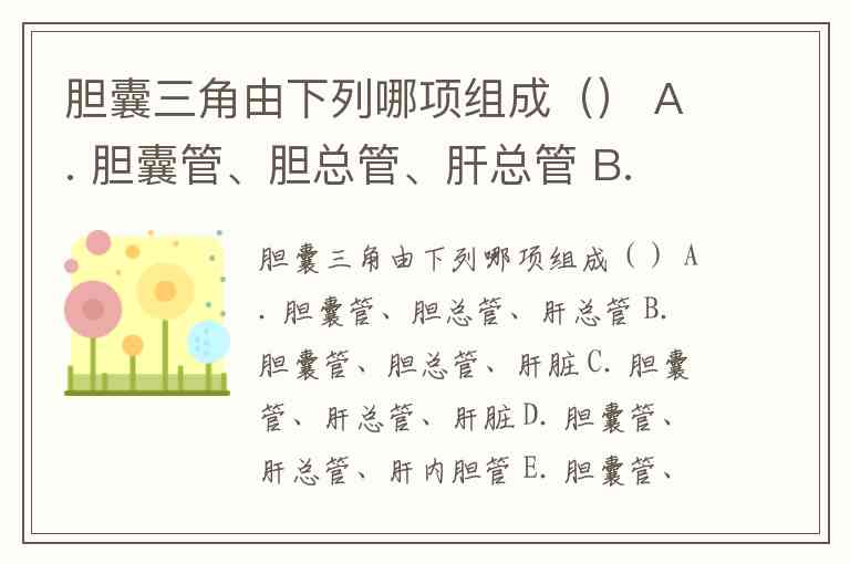 胆囊三角由下列哪项组成() A. 胆囊管、胆总管、肝总管 B. 胆囊管、胆总管、肝脏 C. 胆囊管、肝总管、肝脏 D. 胆囊管、肝总管、肝内胆管 E. 胆囊管、肝脏、肝内胆管