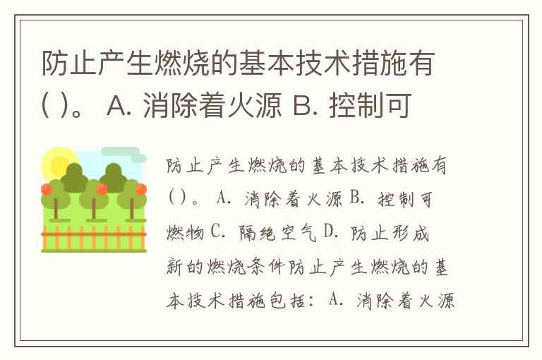 防止产生燃烧的基本技术措施有( )。 A. 消除着火源 B. 控制可燃物 C. 隔绝空气 D. 防止形成新的燃烧条件