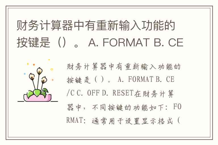 财务计算器中有重新输入功能的按键是()。 A. FORMAT B. CE/C C. OFF D. RESET