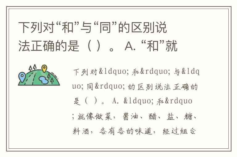 下列对“和”与“同”的区别说法正确的是( )。 A. “和”就像做菜,酱油、醋、盐、糖、料酒,各有各的味道,经过组合搭配,形成菜肴的美味;“同”就像划龙舟,所有人的动作整齐划一,就像一个人一样。 B. “和”是以道相济,出以公心;“同”是以私相循,务为雷同,违道以顺人情。 C. 君子和而不同,小人同而不和。 D. “和”用于各方面之间彼此不同的时候;“同”用于各方面之间完全相同德时候。