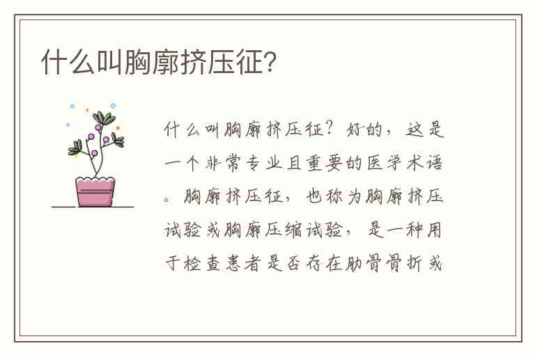 胸廓挤压征,也称为胸廓挤压试验或胸廓压缩试验,是一种用于检查患者是否存在肋骨骨折或胸骨骨折的体格检查方法。