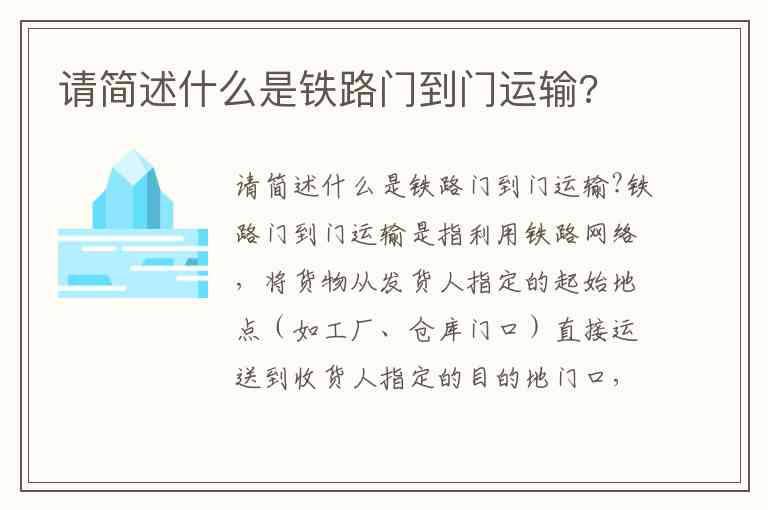 铁路门到门运输是指利用铁路网络,将货物从发货人指定的起始地点(如工厂、仓库门口)直接运送到收货人指定的目的地门口,实现全程“点到点”无缝衔接的运输服务。