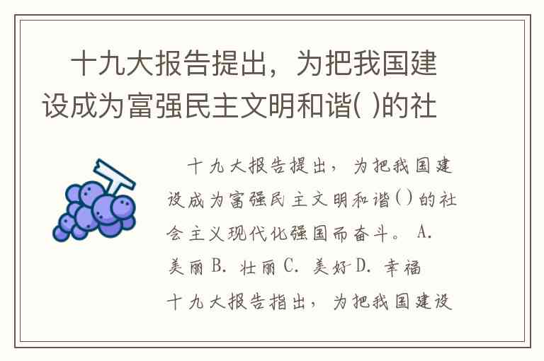 、十九大报告提出,为把我国建设成为富强民主文明和谐( )的社会主义现代化强国而奋斗。 A. 美丽 B. 壮丽 C. 美好 D. 幸福