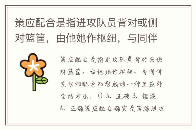 策应配合是指进攻队员背对或侧对篮筐,由他她作枢纽,与同伴空切相配合而形成的一种里应外合的方法。() A. 正确 B. 错误