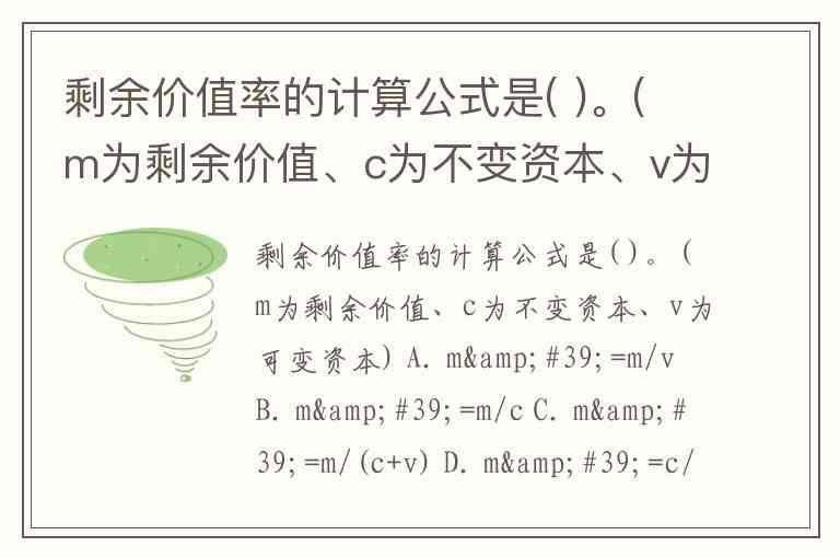 剩余价值率的计算公式是( )。(m为剩余价值、c为不变资本、v为可变资本) A. m'=m/v B. m'=m/c C. m'=m/(c+v) D. m'=c/v