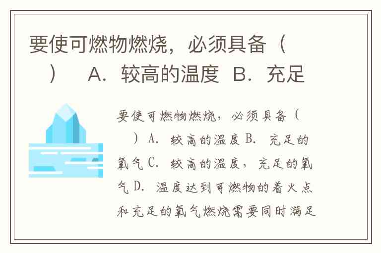 要使可燃物燃烧,必须具备( ) A.较高的温度 B.充足的氧气 C.较高的温度,充足的氧气 D.温度达到可燃物的着火点和充足的氧气