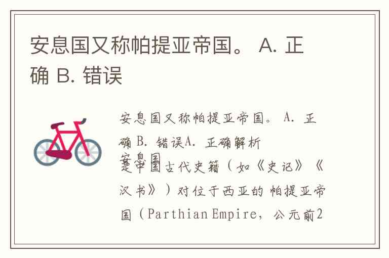 解析安息国是中国古代史籍(如《史记》《汉书》)对位于西亚的 帕提亚帝国(Parthian Empire,公元前247年–公元224年) 的称呼。帕提亚帝国是波斯地区的重要王朝,在汉朝时通过丝绸之路与中国有往来,中国史书称其为“安息”。因此,题目中的说法是正确的。