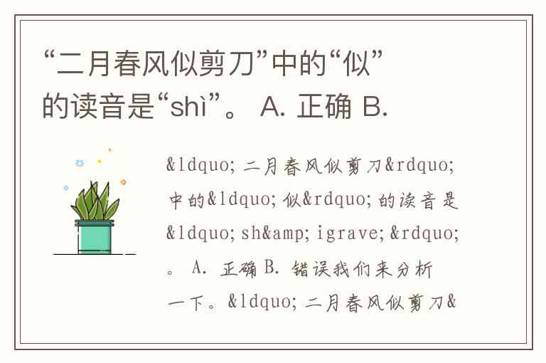 “二月春风似剪刀”中的“似”的读音是“shì”。 A. 正确 B. 错误