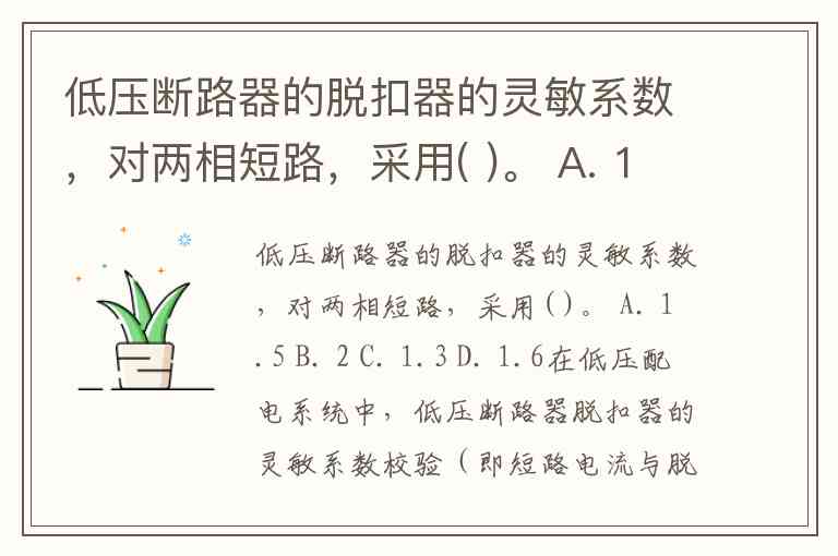 低压断路器的脱扣器的灵敏系数,对两相短路,采用( )。 A. 1.5 B. 2 C. 1.3 D. 1.6