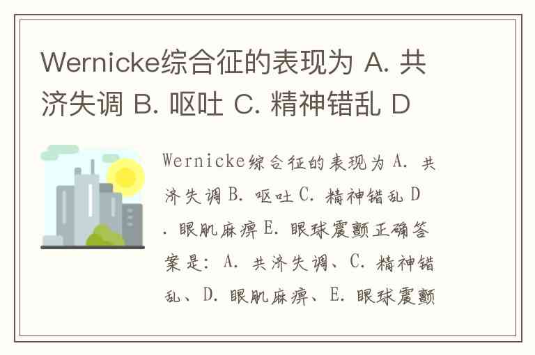 Wernicke综合征的表现为 A. 共济失调 B. 呕吐 C. 精神错乱 D. 眼肌麻痹 E. 眼球震颤