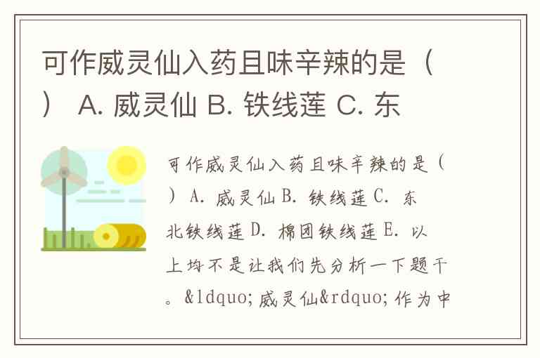 可作威灵仙入药且味辛辣的是() A. 威灵仙 B. 铁线莲 C. 东北铁线莲 D. 棉团铁线莲 E. 以上均不是