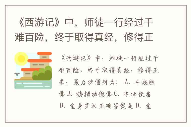 《西游记》中,师徒一行经过千难百险,终于取得真经,修得正果,最后沙僧封为: A. 斗战胜佛 B. 旃檀功德佛 C. 净坛使者 D. 金身罗汉