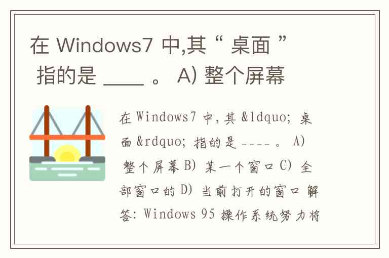 在 Windows7 中,其 “ 桌面 ” 指的是 ____ 。 A) 整个屏幕 B) 某一个窗口 C) 全部窗口的 D) 当前打开的窗口 解答: Windows 95 操作系统努力将复杂的计算机操作变得简单,贴近用户的日常逻辑。在 Windows95 操作系统中,某系统启动成功后,整个屏幕称之为 “ 桌面 ” 。 本题正确答案为 A 。 A. 整个屏幕 B. 某一个窗口 C. 全部窗口的 D. 当前打开的窗口
