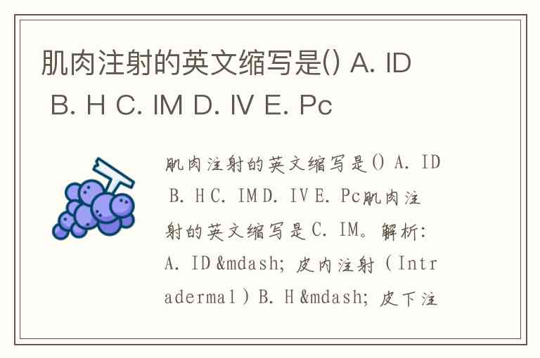 肌肉注射的英文缩写是() A. ID B. H C. IM D. IV E. Pc