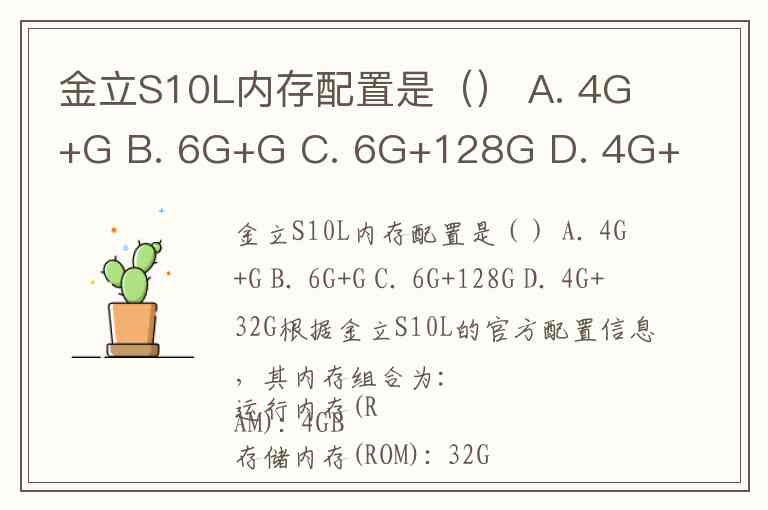 金立S10L内存配置是() A. 4G+G B. 6G+G C. 6G+128G D. 4G+32G