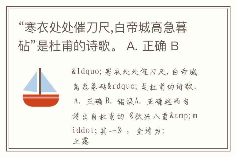 “寒衣处处催刀尺,白帝城高急暮砧”是杜甫的诗歌。 A. 正确 B. 错误