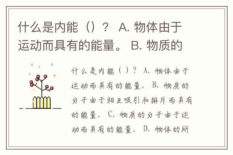 什么是内能()? A. 物体由于运动而具有的能量。 B. 物质的分子由于相互吸引和排斥而具有的能量。 C. 物质的分子由于运动而具有的能量。 D. 物体的所有分子动能和分子势能的总和叫做内能。