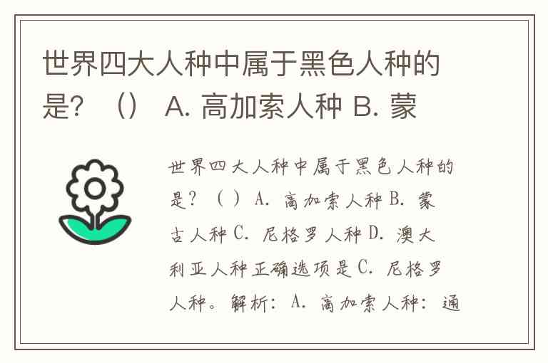 世界四大人种中属于黑色人种的是?() A. 高加索人种 B. 蒙古人种 C. 尼格罗人种 D. 澳大利亚人种