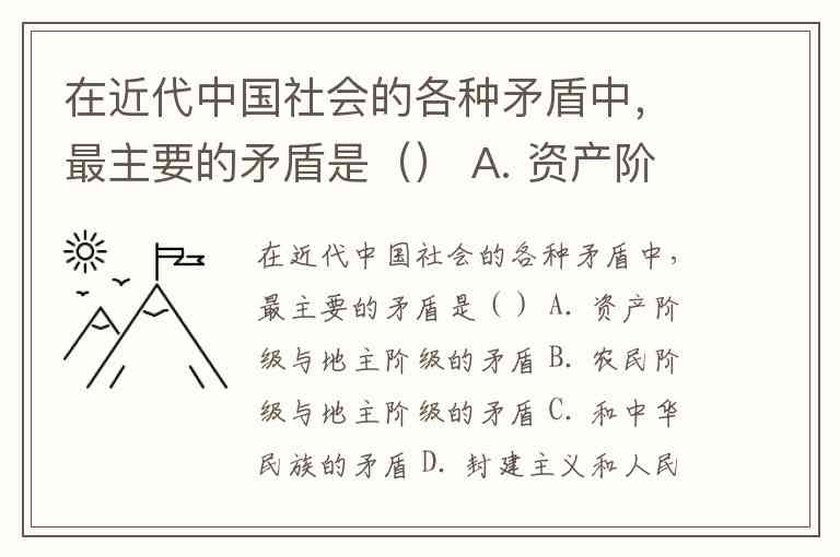 在近代中国社会的各种矛盾中,最主要的矛盾是() A. 资产阶级与地主阶级的矛盾 B. 农民阶级与地主阶级的矛盾 C. 和中华民族的矛盾 D. 封建主义和人民大众的矛盾