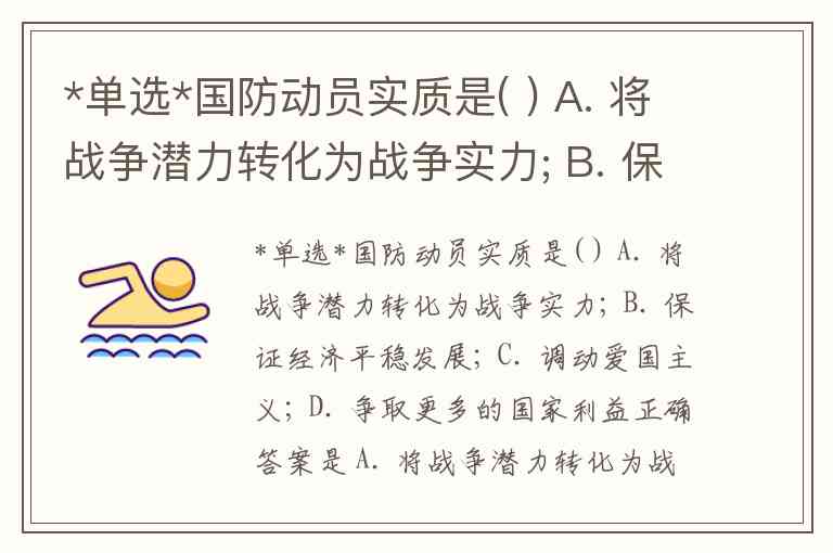 *单选*国防动员实质是( ) A. 将战争潜力转化为战争实力; B. 保证经济平稳发展; C. 调动爱国主义; D. 争取更多的国家利益