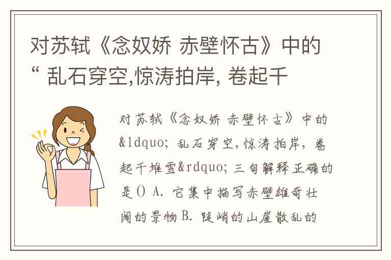 对苏轼《念奴娇 赤壁怀古》中的“ 乱石穿空,惊涛拍岸, 卷起千堆雪”三句解释正确的是() A. 它集中描写赤壁雄奇壮阔的景物 B. 陡峭的山崖散乱的高插云霄 C. 汹涌的骇浪猛烈的搏击着江岸 D. 滔滔的江流卷起千万堆澎湃的雪浪 E. 把读者顿时带进一个幽美静谧的境界