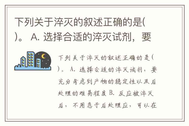 下列关于淬灭的叙述正确的是( )。 A. 选择合适的淬灭试剂,要充分考虑到产物的稳定性以及后处理的难易程度 B. 反应被淬灭后,不用急于后处理应,可以在有空余时间时再处理 C. 如果淬灭过程会大量放热,须在冷却下进行淬灭 D. 只有当TLC或其他分析手段显示反应结束,才能对反应进行淬灭