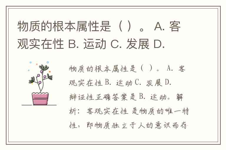 物质的根本属性是( )。 A. 客观实在性 B. 运动 C. 发展 D. 辩证性