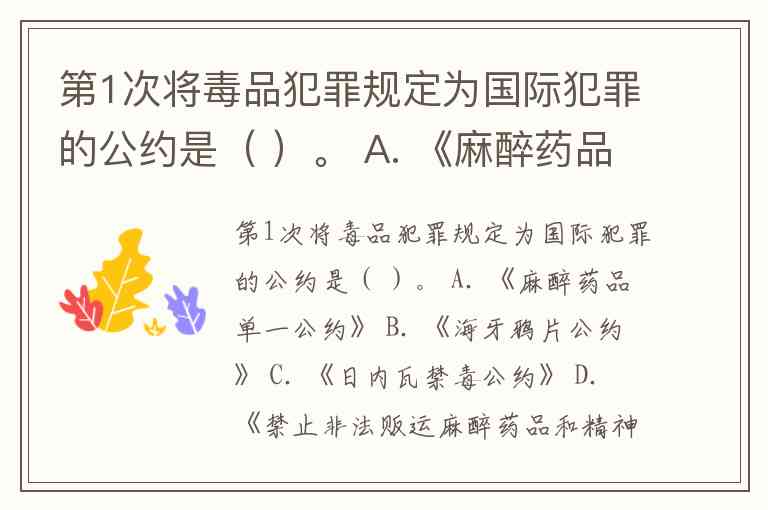 第1次将毒品犯罪规定为国际犯罪的公约是( )。 A. 《麻醉药品单一公约》 B. 《海牙鸦片公约》 C. 《日内瓦禁毒公约》 D. 《禁止非法贩运麻醉药品和精神药物公约》