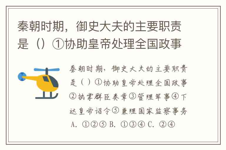 秦朝时期,御史大夫的主要职责是()①协助皇帝处理全国政事②执掌群臣奏章③管理军事④下达皇帝诏令⑤兼理国家监察事务 A. ①②⑤ B. ①③④ C. ②④⑤ D. ③④⑤
