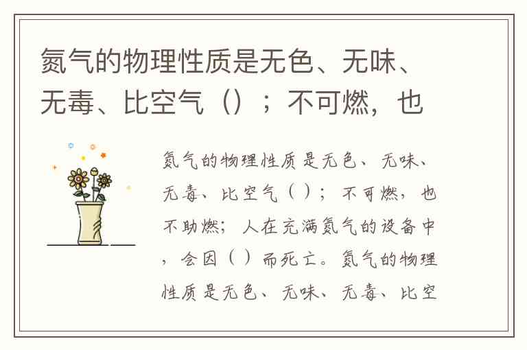 氮气的物理性质是无色、无味、无毒、比空气();不可燃,也不助燃;人在充满氮气的设备中,会因()而死亡。