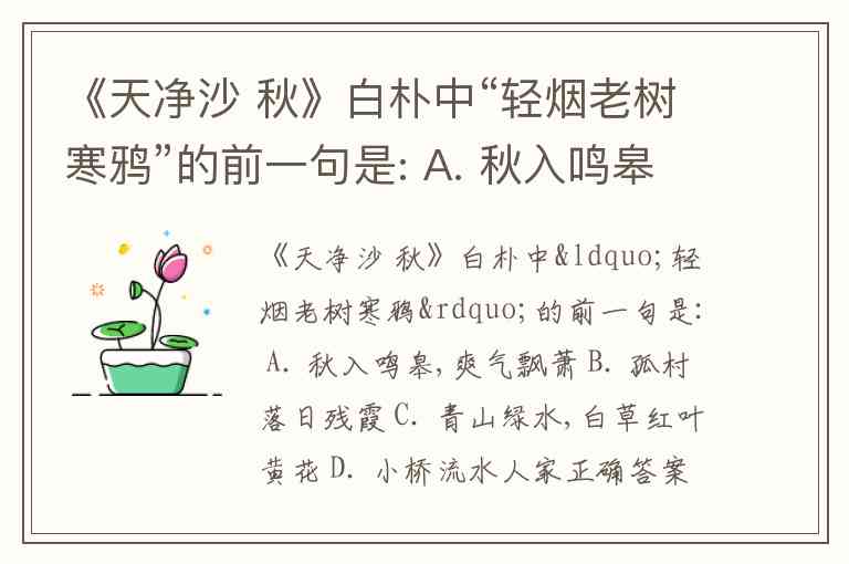 《天净沙 秋》白朴中“轻烟老树寒鸦”的前一句是: A. 秋入鸣皋,爽气飘萧 B. 孤村落日残霞 C. 青山绿水,白草红叶黄花 D. 小桥流水人家