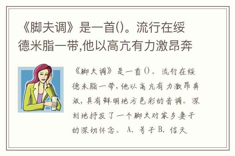 《脚夫调》是一首()。流行在绥德米脂一带,他以高亢有力激昂奔放,具有鲜明地方色彩的音调。深刻地抒发了一个脚夫对家乡妻子的深切怀念。 A. 号子 B. 信天游 C. 小调 D. 梆子