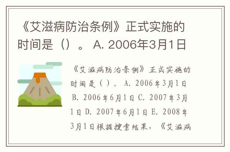 《艾滋病防治条例》正式实施的时间是()。 A. 2006年3月1日 B. 2006年6月1日 C. 2007年3月1日 D. 2007年6月1日 E. 2008年3月1日