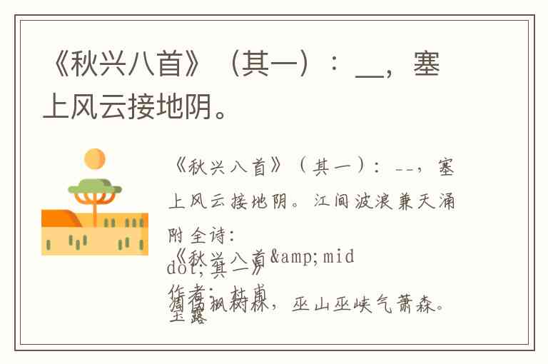 附全诗:《秋兴八首·其一》作者:杜甫玉露凋伤枫树林,巫山巫峡气萧森。江间波浪兼天涌,塞上风云接地阴。丛菊两开他日泪,孤舟一系故园心。寒衣处处催刀尺,白帝城高急暮砧。