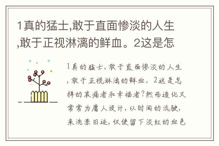 1真的猛士,敢于直面惨淡的人生,敢于正视淋漓的鲜血。2这是怎样的哀痛者和幸福者?然而造化又常常为庸人设计,以时间的流驶,来洗涤旧迹,仅使留下淡红的血色和微漠的悲哀。在这淡红的血色和微漠的悲哀中,又给人以暂得偷生,维持着这似人非人的世界。5我不知道这样的世界何时是一个尽头! 对文段中第12两句解说不正确的一项是: ( ) A. 从行文思路看,整句是对刘和珍等烈士的热情歌颂和赞扬。 B. “直面”,直接面对;“正视”,正眼看,不回避。“哀痛者”,“ 以……为哀痛的人”;“幸福者”,“ 以……为幸福的人” , “哀痛者”、“幸福者”,都是指刘和珍等革命青年。 C. 两个“敢于”简练而又传神地表现了真正勇猛的革命者对现实、对惨案的大无畏精神。 D. ②是一般的疑问句,用提问的方式启发读者思考,“这”代“真的猛士”他们积极投身 摧毁黑暗社会的革命斗争,却惨遭屠杀,这是多么令人哀痛啊!