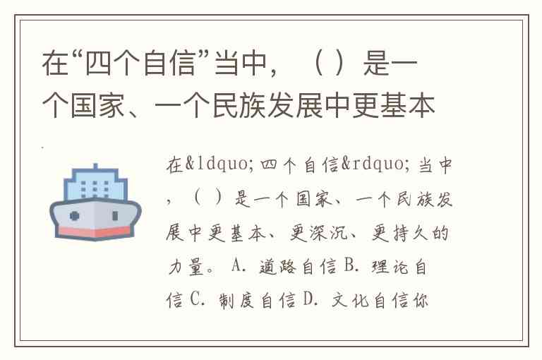 在“四个自信”当中,( )是一个国家、一个民族发展中更基本、更深沉、更持久的力量。 A. 道路自信 B. 理论自信 C. 制度自信 D. 文化自信