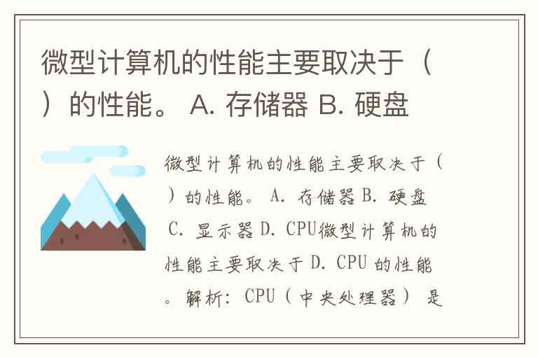 微型计算机的性能主要取决于()的性能。 A. 存储器 B. 硬盘 C. 显示器 D. CPU