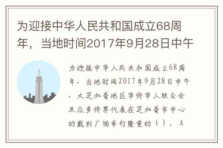 为迎接中华人民共和国成立68周年,当地时间2017年9月28日中午,大芝加哥地区华侨华人联合会及众多侨界代表在芝加哥市中心的戴利广场举行隆重的()。 A. B. C. 升旗仪式 D. 招待会
