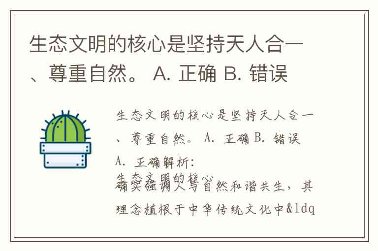 生态文明的核心是坚持天人合一、尊重自然。 A. 正确 B. 错误