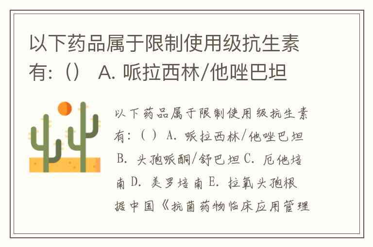 因此,属于限制使用级的有 A、B、C(部分地区)、E,但严格对照考试常见答案(C 是否限制级有争议,但近年不少考试题将厄他培南列为限制级)。