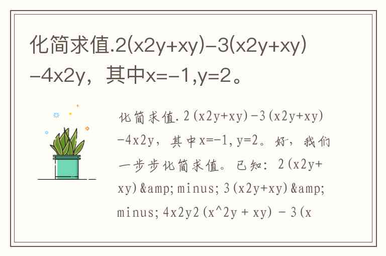 化简求值.2(x2y+xy)-3(x2y+xy)-4x2y,其中x=-1,y=2。