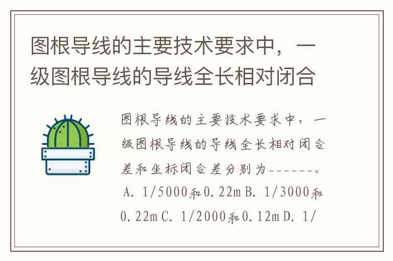 图根导线的主要技术要求中,一级图根导线的导线全长相对闭合差和坐标闭合差分别为______。 A. 1/5000和0.22m B. 1/3000和0.22m C. 1/2000和0.12m D. 1/5000和0.12m