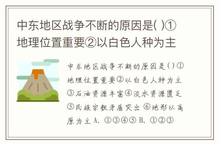 中东地区战争不断的原因是( )①地理位置重要②以白色人种为主③石油资源丰富④淡水资源匮乏⑤民族宗教矛盾突出 ⑥地形以高原为主 A. ①③④⑤ B. ①②③④⑤⑥ C. ②④⑤⑥ D. ①④⑤⑥