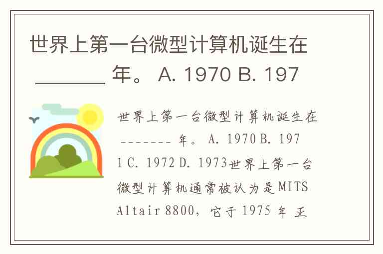 世界上第一台微型计算机诞生在 _______ 年。 A. 1970 B. 1971 C. 1972 D. 1973