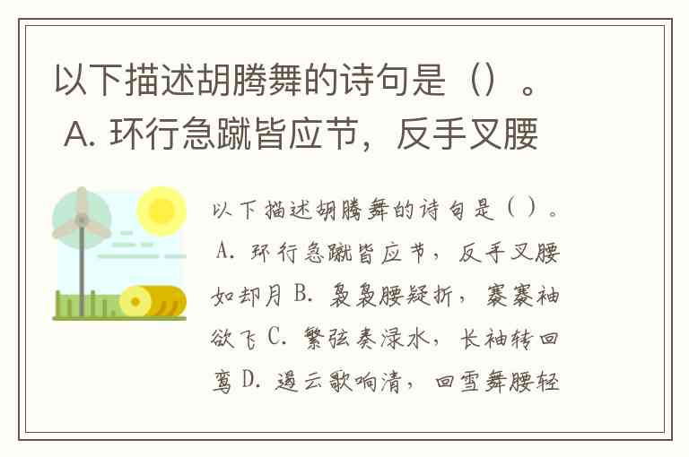 以下描述胡腾舞的诗句是()。 A. 环行急蹴皆应节,反手叉腰如却月 B. 袅袅腰疑折,褰褰袖欲飞 C. 繁弦奏渌水,长袖转回鸾 D. 遏云歌响清,回雪舞腰轻
