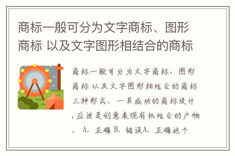 商标一般可分为文字商标、图形商标 以及文字图形相结合的商标三种形式。一具成功的商标设计,应该是创意表现有机结合的产物。 A. 正确 B. 错误