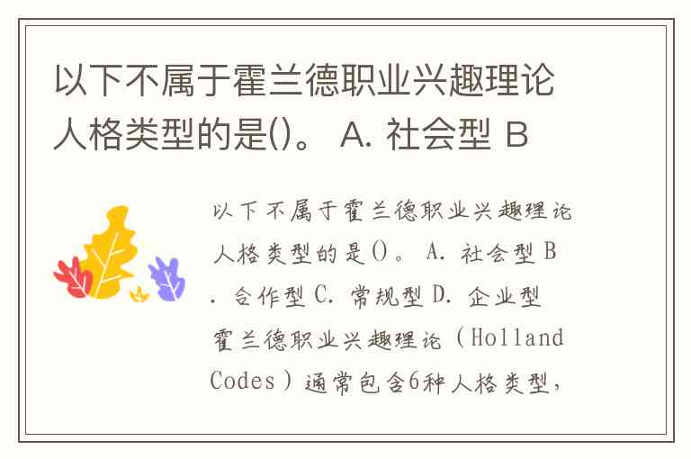 以下不属于霍兰德职业兴趣理论人格类型的是()。 A. 社会型 B. 合作型 C. 常规型 D. 企业型