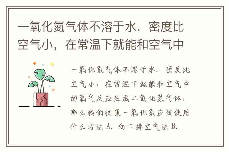 一氧化氮气体不溶于水.密度比空气小,在常温下就能和空气中的氧气反应生成二氧化氮气体,那么我们收集一氧化氮应该使用什么方法 A. 向下排空气法 B. 排水法 C. 排水法或向下排空气法 D. 排水法或向上排空气法